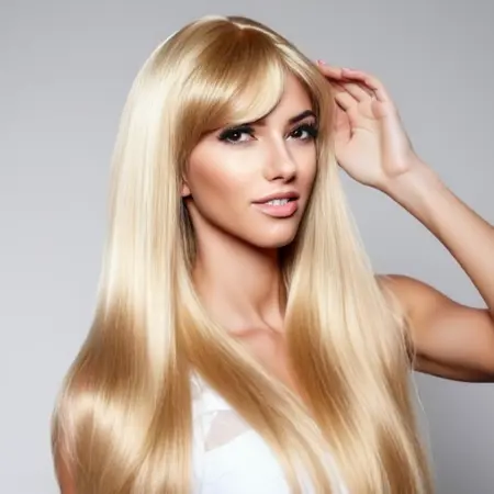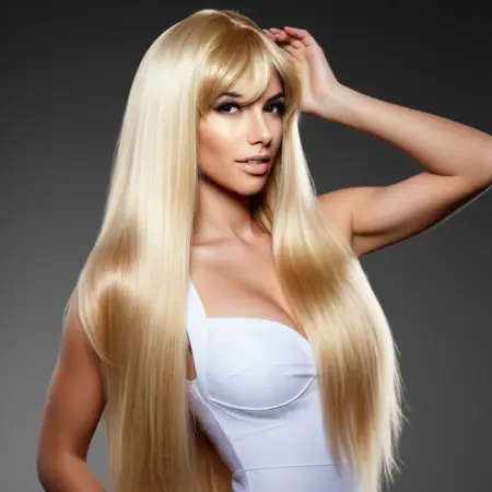 blondegirl. A young woman with silky shiny long blonde hair with fairer skin. She wears a white dress standing with alluring pose while holding her silky long blonde hair