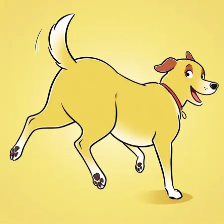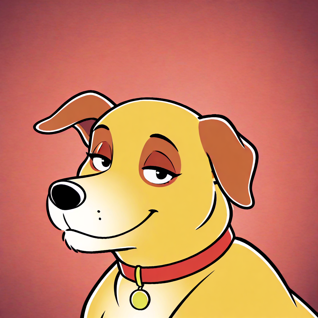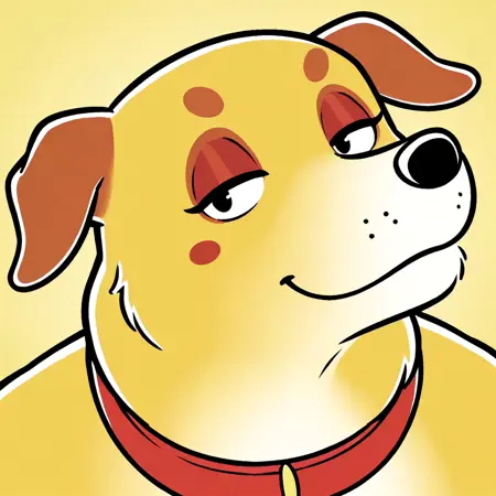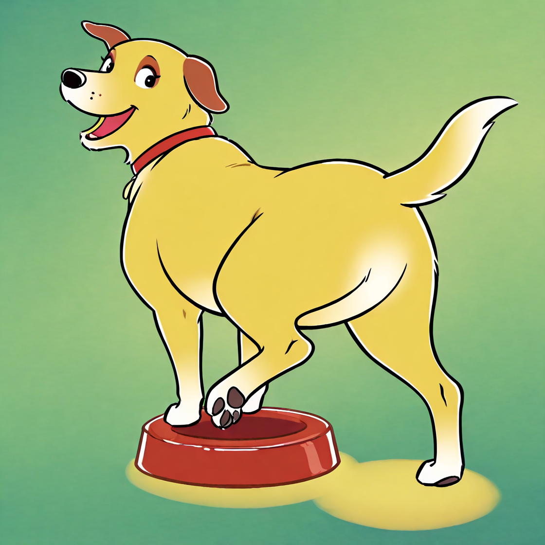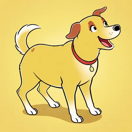 dog, female, yellow fur, white fur, brown fur, black eyes, eye spots, red collar, slightly chubby