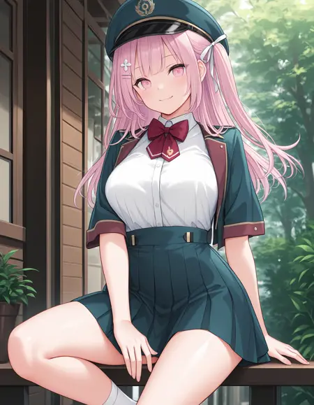 outfit01, Otomeki uniform, jacket, Otomeki jacket, open jacket, shirt, white shirt, collared shirt, striped shirt, half sleeves, bowtie, red bowtie, skirt, Otomeki skirt, pleated skirt, socks, white socks, loafer, {beret|}