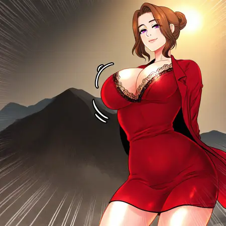 Ajumma: a2umma, beautiful brown hair, hairbun, huge and shaggy breasts, beautiful purple eyes, /short twin pigtails
