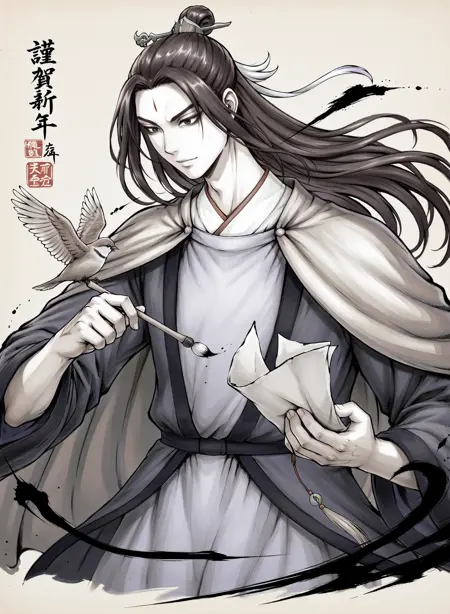 | Trained Words | 1boy, male focus, solo, bird on hand, long hair, bird, forehead mark, hair bun, looking at viewer, facial mark, single hair bun, closed mouth, standing, hair stick, ShinDoryong, ShinDoryong_clothesCopied! solo, 1boy, male focus, long hair, holding, full body, forehead mark, hair bun, standing, looking at viewer, black footwear, closed mouth, facial mark, boots, bindi, hanfu, weapon, single hair bun, ShinDoryong, ShinDoryong_clothesCopied! |