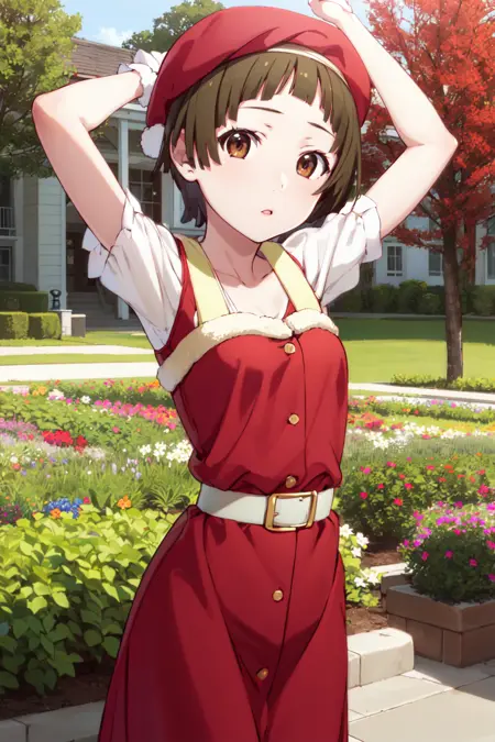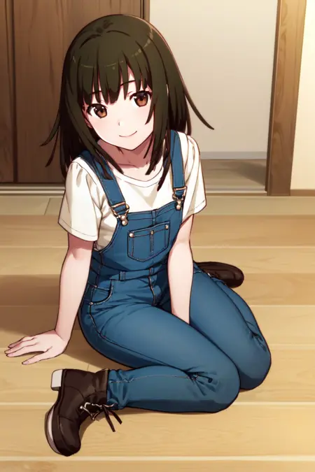 nadeko01, medium hair, brown hair, brown eyes, bangs, overalls, blue pants