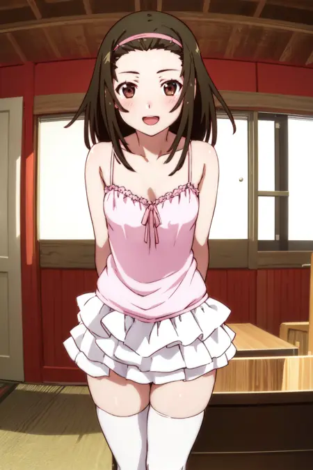 nadeko01, medium hair, brown hair, brown eyes, hairband, forehead, thighhighs, bare shoulders, white thighhighs, white skirt, zettai ryouiki, frilled skirt, pink camisole, layered skirt **bangs, blunt bangs,**