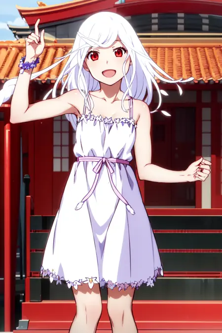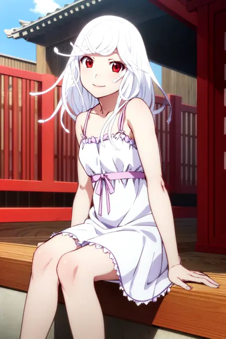 nadeko02, long hair, red eyes, white hair, (snake hair, medusa,) bare shoulders, collarbone, white dress