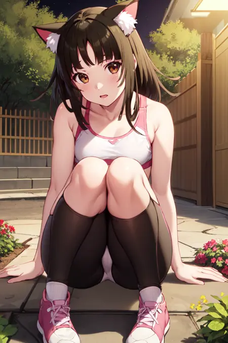 nadeko01, short hair, blunt bangs, brown hair, brown eyes, track jacket, track suit, track pants, red pants, red track suit