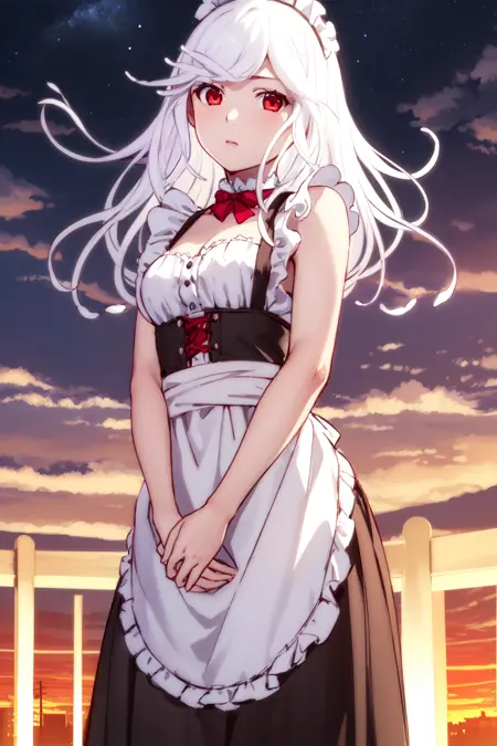 nadeko02, short hair, red eyes, white hair, bangs, blunt bangs, skirt, long sleeves, school uniform, collarbone, white shirt, serafuku, blunt bangs, sailor collar, neckerchief, necktie, suspenders