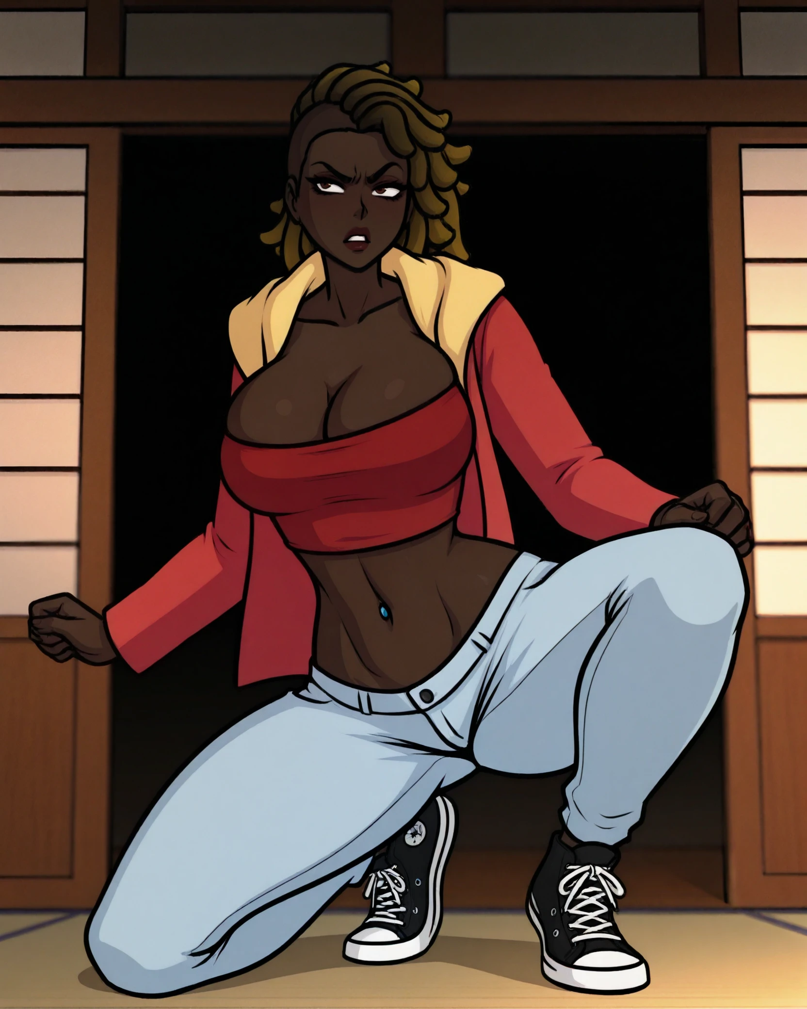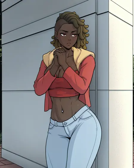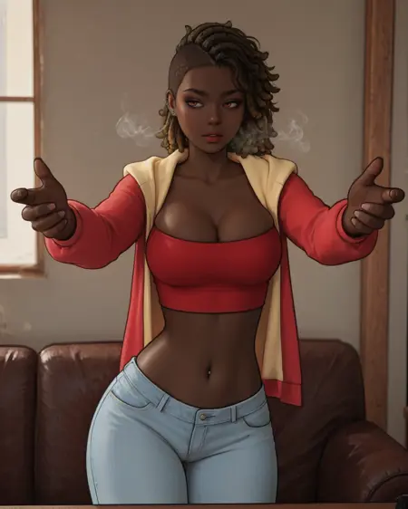 Trigger: F3mfrl0ck, 1girl, very dark skin, dreadlocks, cleavage, navel piercing, jacket, crop top, midriff, denim, pants