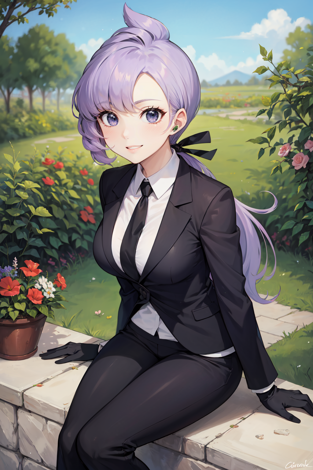 anabel, shirt, long hair, ponytail, long sleeves, ribbon, hair ribbon, jacket, white shirt, black gloves, necktie, pants, black jacket, black ribbon, black necktie, collared shirt, black pants, formal