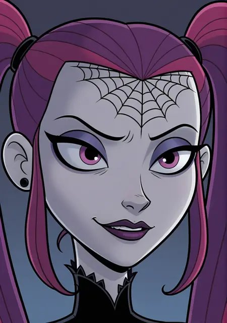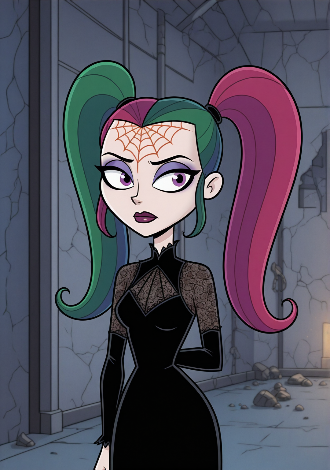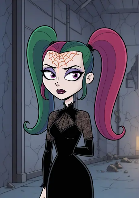 Main triggers: hfcreepie, multicolored hair, high pigtails, forehead spiderweb