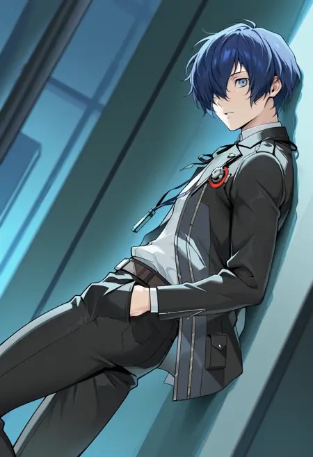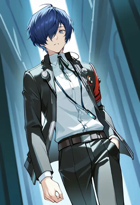 Yuuki, yuuki makoto (persona 3), 파란 머리, 파란 눈, 한쪽 눈 위로 흐르는 머리카락