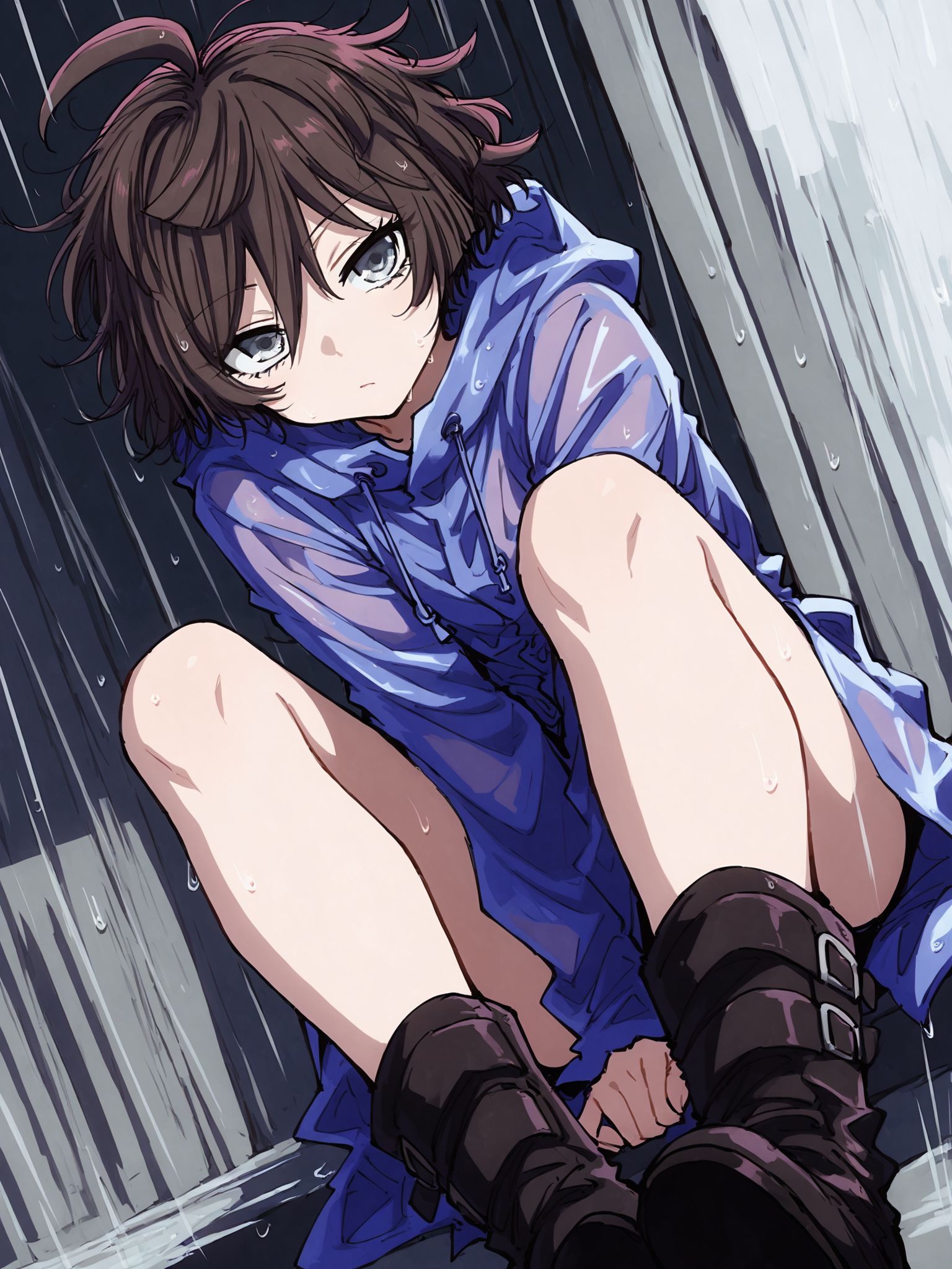 blue raincoat,purple raincoat,hoodie,hood down,long sleeves,drawstring,boots,