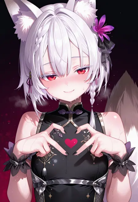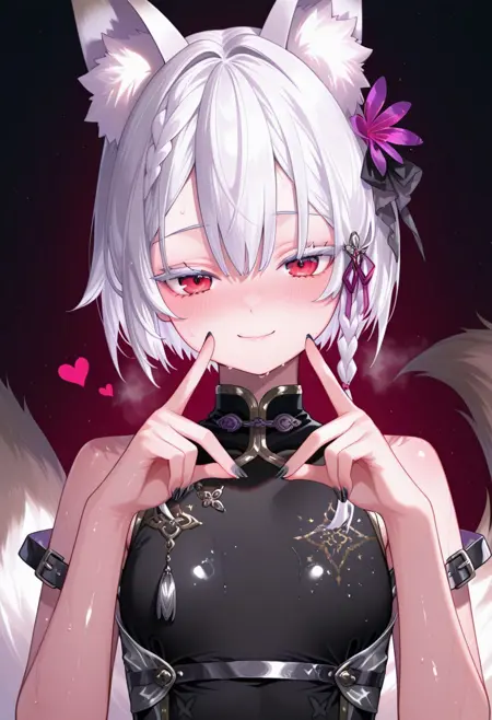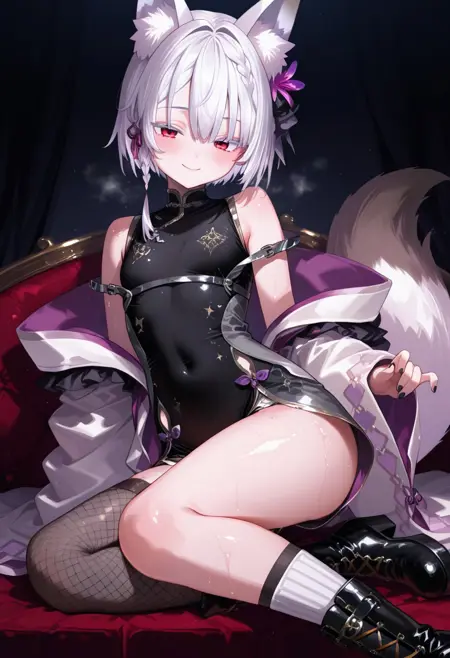 mikagetuki, 1girl, 여우 귀, 회색 머리, 짧은 머리, 꽃 장식, 땋은 머리 장식, 빨간 눈, 롬퍼, 나비 장식, 옷 디테일, 작은 가슴, 여우 꼬리, 검은 손톱, 비대칭 다리 신발, 피시넷 허벅지 양말, 검은 부츠