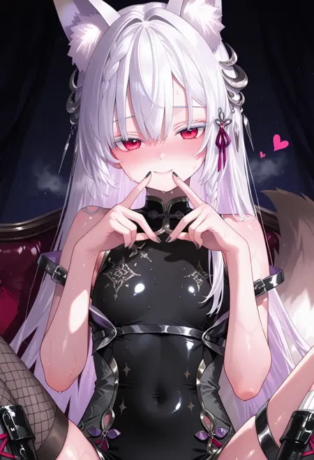 mikagetuki, 1girl, 여우 귀, 회색 머리, 긴 머리, 긴 머리 장식, 빨간 눈, 롬퍼, 나비 장식, 옷 디테일, 작은 가슴, 여우 꼬리, 검은 손톱, 비대칭 다리 신발, 피시넷 허벅지 양말, 검은 부츠