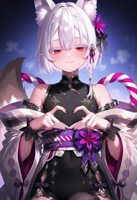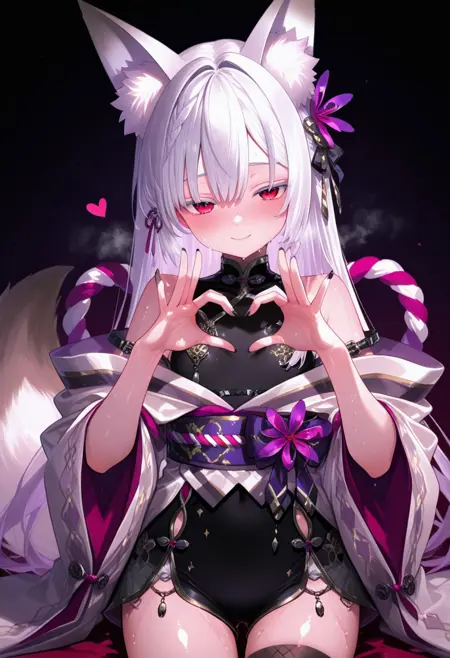 mikagetuki, 1girl, 여우 귀, 회색 머리, 짧은 머리, 꽃 장식, 땋은 머리 장식, 빨간 눈, 김포, 롬퍼, 나비 장식, 옷 디테일, 작은 가슴, 어깨 드러냄, 오비, 시메나와, 오비 꽃, 여우 꼬리, 검은 손톱, 비대칭 다리 신발, 피시넷 허벅지 양말, 검은 부츠