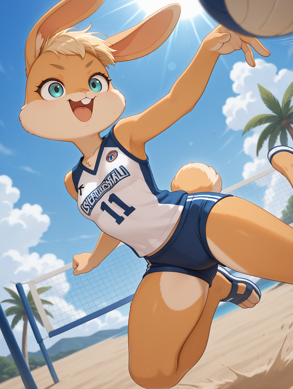 추가 태그: 페르리 여성, 이톤 털, 주황색 털, 금발 털, 몸 털, 금발 머리, 매우 짧은 머리, 토끼 코, 토끼 귀, 토끼 꼬리, 묶인 귀, 동물 발, 아쿠아 눈, 보라색 아이섀도, 돌출된 어금니, 작은 가슴, 흰색 운동 반바지, 흰색 크롭탑, 흰장갑, 전신