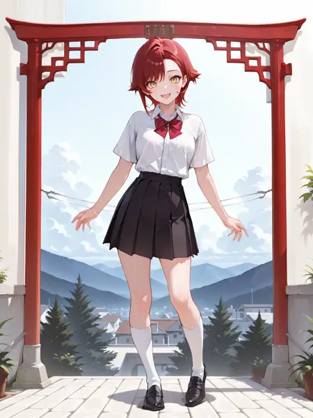 red bow,bowtie,red ribbon,school uniform,white shirt,short sleeves,collared shirt,shirt tucked in,black skirt,pleated skirt,black footwear,white socks, loafers,
