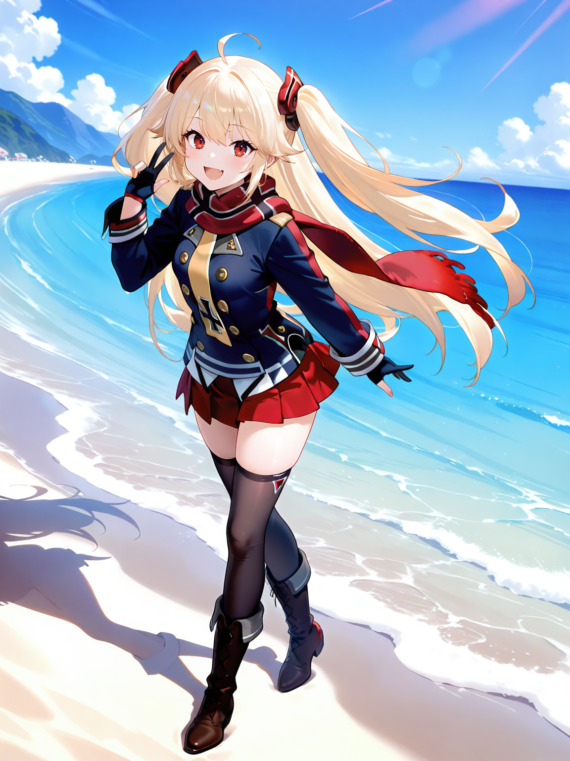 blucher(azur_lane),blonde hair,very long hair,bangs,twintails,ahoge,red eyes,fang,