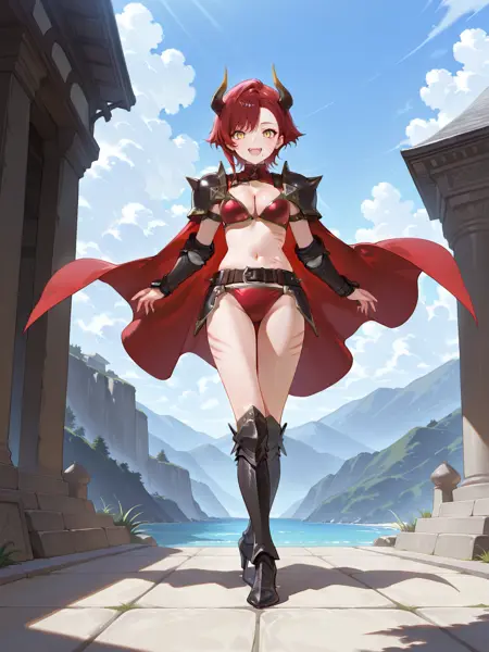 horns,navel, cleavage,red cape,vambraces,red bikini,bikini armor,spiked pauldrons,buckle,belt,black footwear,knee boots,high heel boots,armored boots,