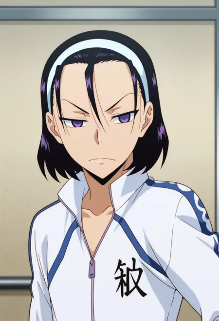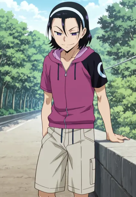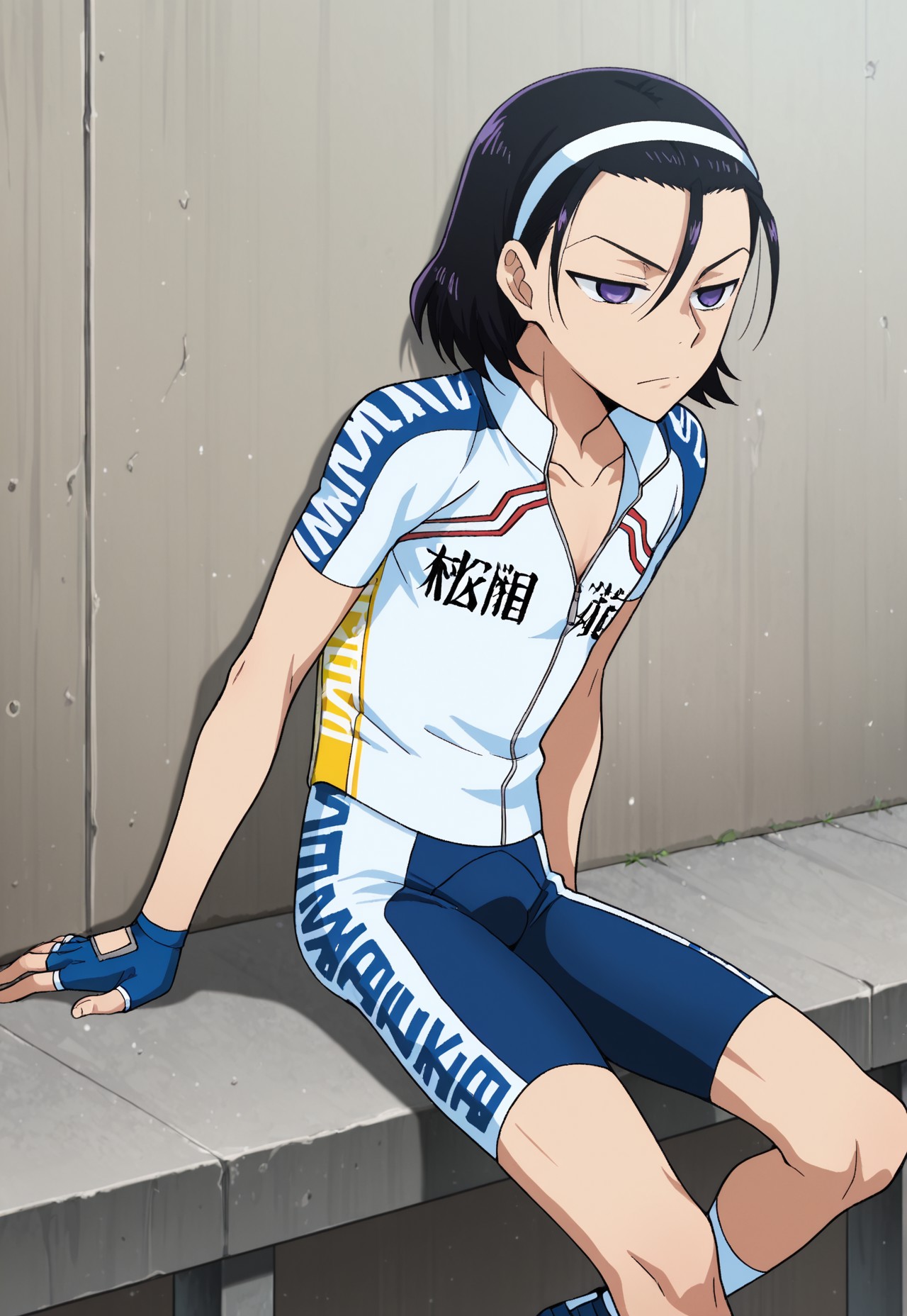 1boy, male focus, solo, purple eyes, black hair, hairband, cycling uniform, blue shirt, collarbone, short sleeves, fingerless gloves, blue gloves, blue shorts, bike shorts, white socks, shoes, blue footwear,