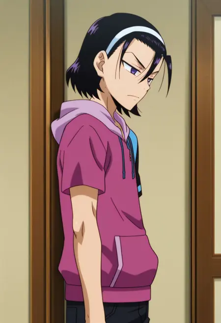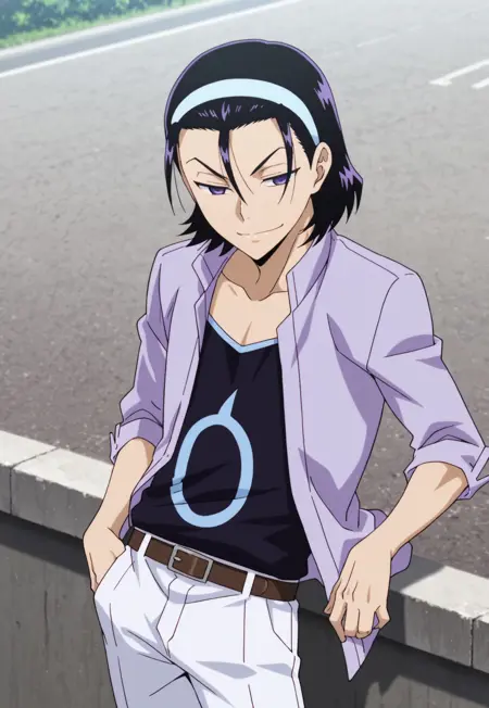 1boy, male focus, solo, purple eyes, black hair, hairband, school uniform, blue shirt, collared shirt, red necktie, blue jacket, striped jacket, open jacket, belt, black pants
