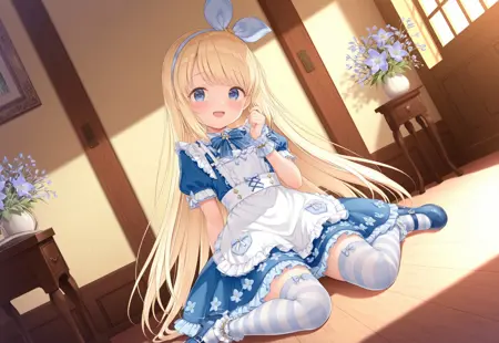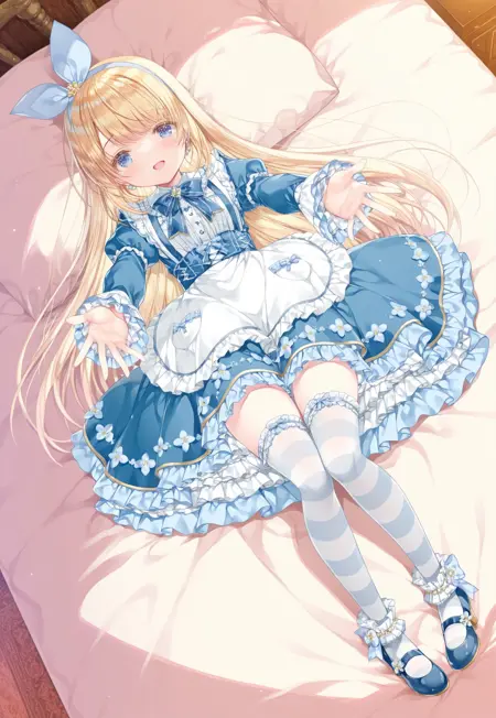 bluet_ope,bow hairband,frilled dress,blue dress,apron,bow,ribbon,puffy sleeves,short sleeves,striped thighhighs,black mary janes