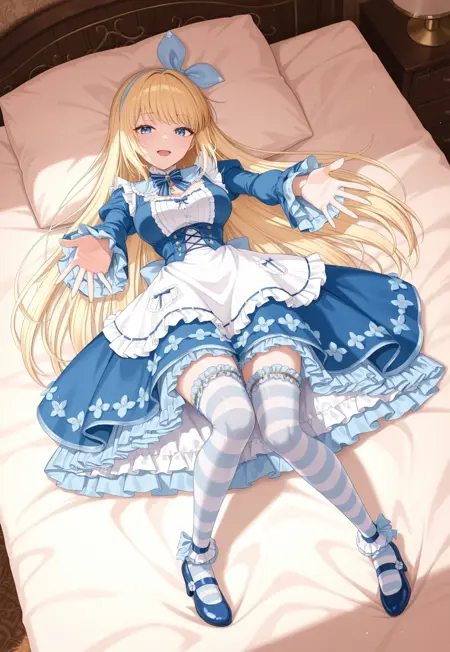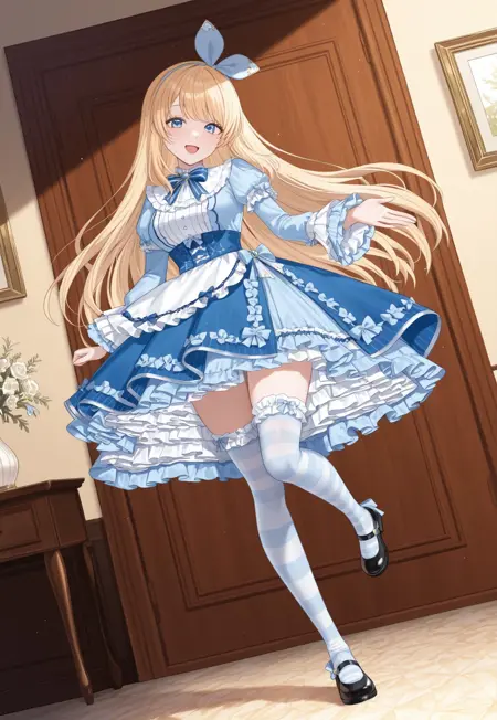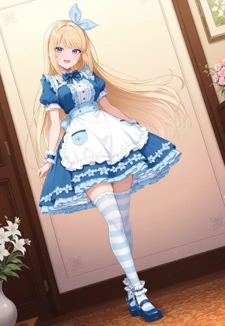 bluet_ob,bow hairband,frilled dress, blue dress,apron,bow,ribbon,puffy sleeves,long sleeves,frilled sleeves,striped thighhighs,black mary janes,high heels