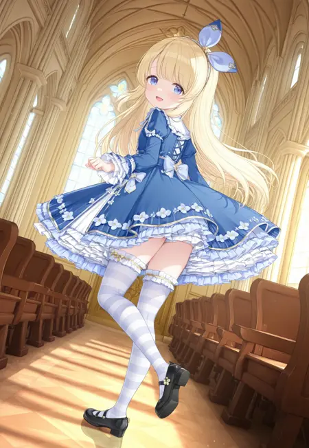bluet_rspe,bow hairband,frilled dress,blue dress,layered dress,dress flower,bow,ribbon,puffy sleeves,long sleeves,frilled sleeves,strpied thighhighs,frilled thighhighs,black mary janes