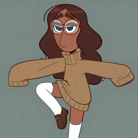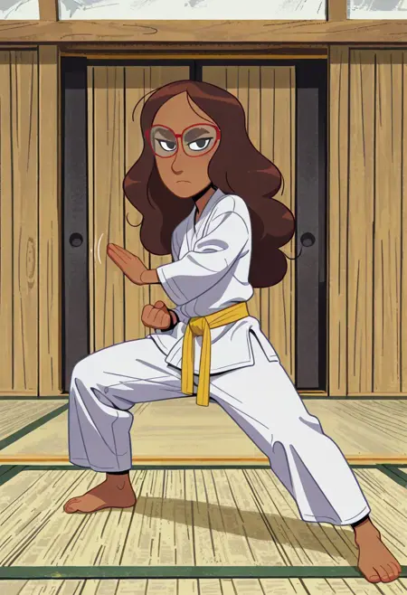 | 학습된 단어 | long hair, wavy hair, brown hair, thick eyebrows, brown skinned female, dark-red frames glasses,복사됨! red jacket, striped-blue shirt, dark-grey pants, beige socks, brown pull up boots,복사됨! white dougi, long sleeves, yellow belt, barefoot,복사됨! |