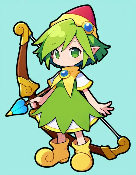 Recommended Prompts: 1girl, short hair, green hair, green eyes, pointy ears, medium breasts, hat, dress, gem, yellow boots,