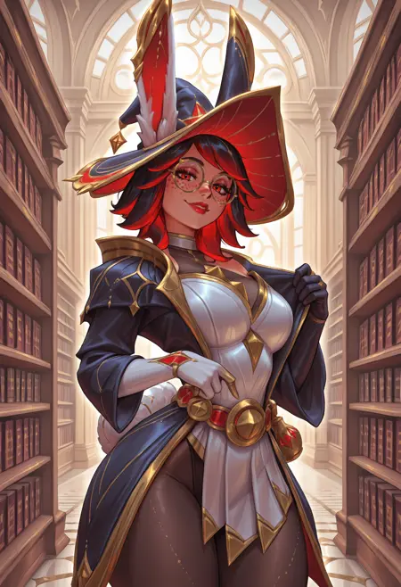 aaurorail, 兔女郎, 大胸, 中长发, 黑发, 红发, 多色发, 雀斑, 红眼, 红唇, 宽臀, 长袖, 手套, 连衣裙, 帽子, 腰带, 兔耳, 兔尾, 圆形眼镜, 耳朵穿过头饰, 夹克, 开襟夹克, 黑色连裤袜, 女巫帽, 肘套手套, 不匹配的手套,