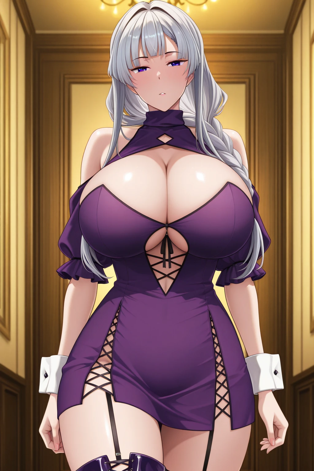 Lenna Brooklyn, succubus, long hair, straight hair, braided ponytail, bangs, strands of hair that frame the face, silver hair, blue eyes, detailed iris, big breasts, dark military uniform, white cuffs, gloves, high boots, blowjob face, blowjob, tongue