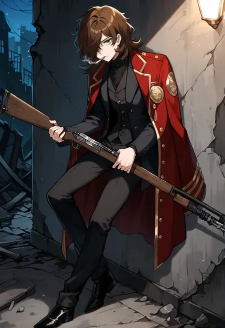 black turtleneck, black jacket, open jacket, black vest, red coat, coat on shoulders, black pants, black footwear