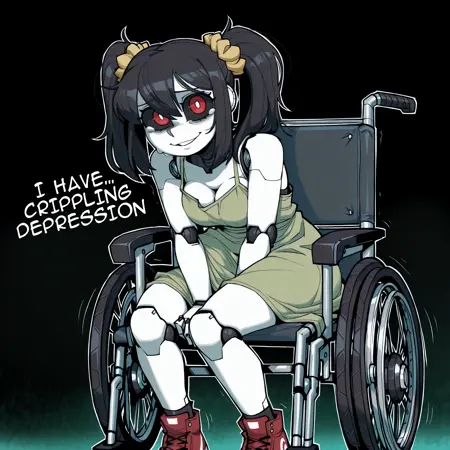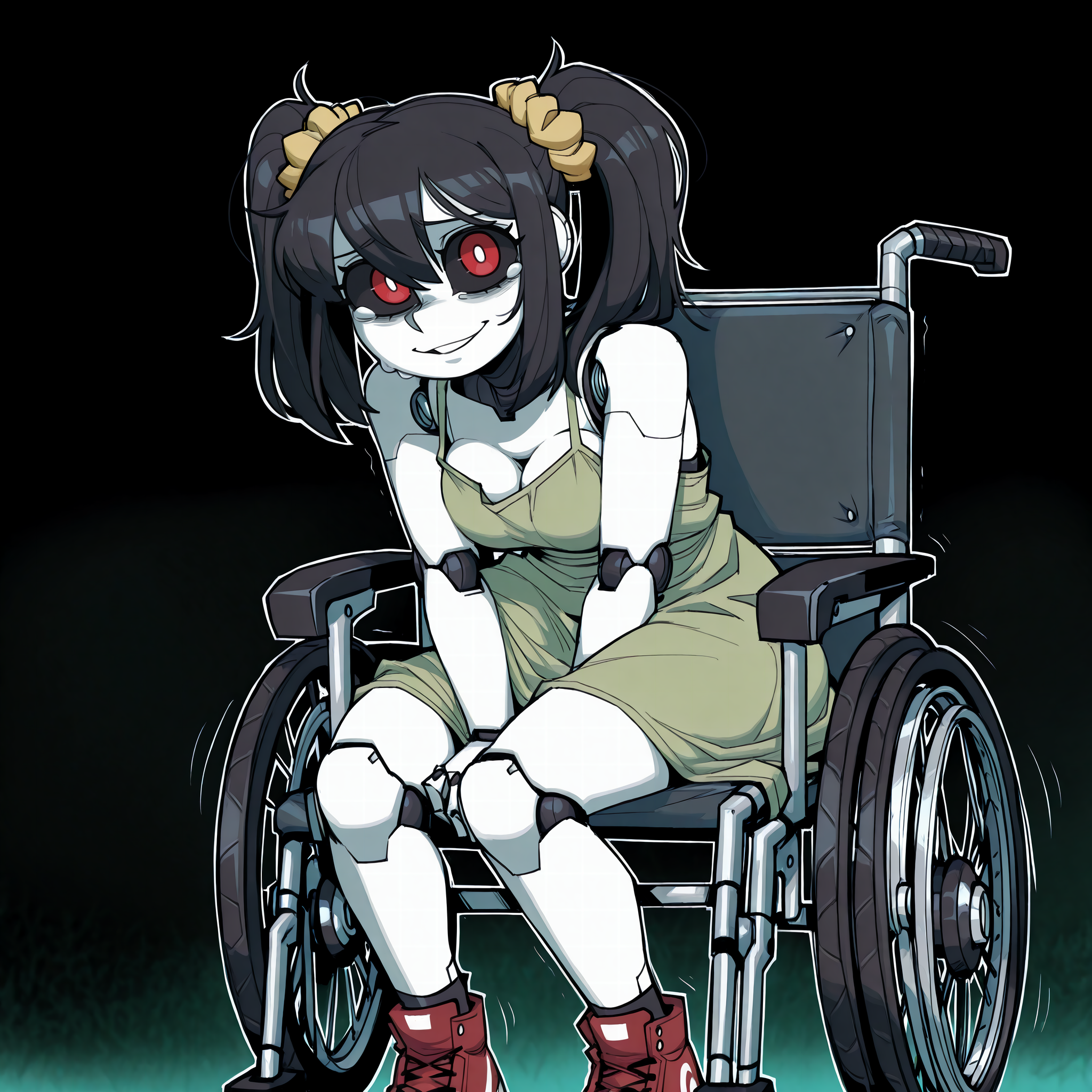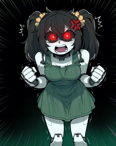 Тэги: ruinya-chan, robot, android, joints, robot joints, black hair, long hair, twintails, hair between eyes, bangs, yellow scrunchie, hair scrunchie, black sclera, red eyes,