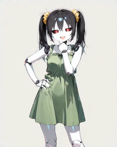 Tags: ruinya-chan, robot, android, joints, robot joints, black hair, long hair, twintails, hair between eyes, bangs, yellow scrunchie, hair scrunchie, black sclera, red eyes,