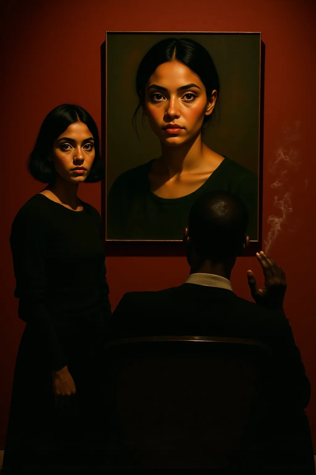 **galchroma scene**, (一幅宏伟的黑檀女神古典肖像:1.3), (站立在画廊中直视观众的活生生的黑檀女神模特:1.3), (她苍白的白化国王背对镜头而坐:1.2), 深红色墙壁的博物馆,电影烟雾,戏剧性光影