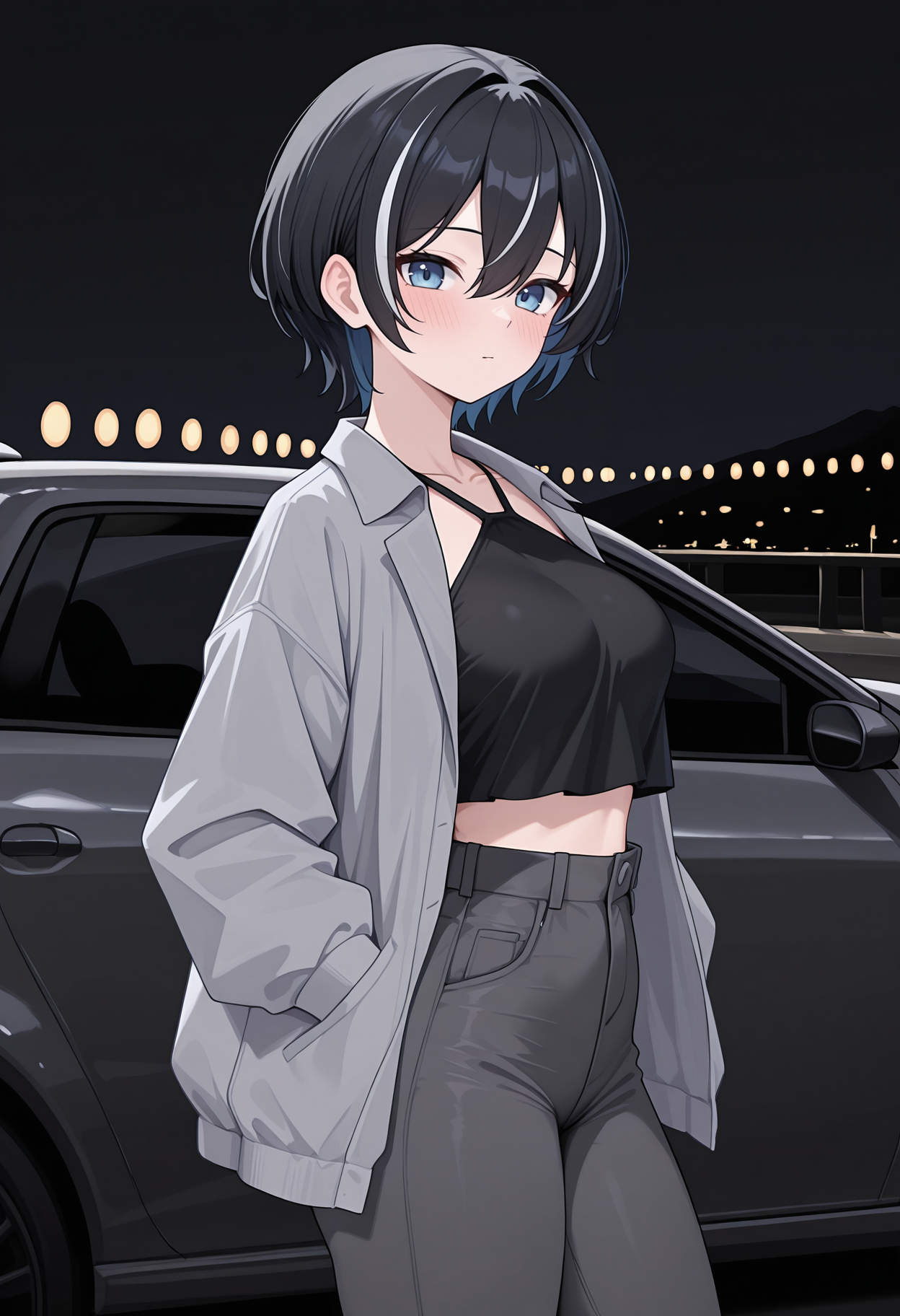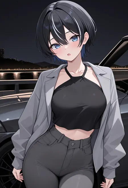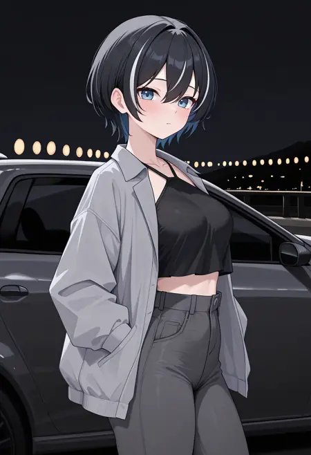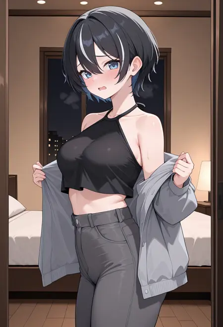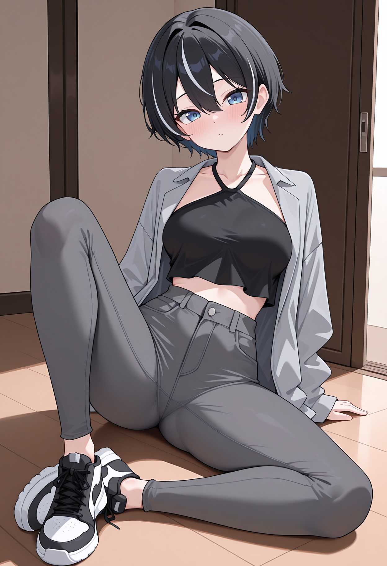 검은 크롭탑, 검은 셔츠, 할터넥, collarbone, 회색 재킷, 벌어진 재킷, 허리 노출, 높은 허리 바지, 검은 바지, 회색 바지, 검은 신발, 스니커즈,
