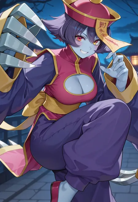 "HSENDS, qing guanmao, blue skin, colored skin, purple hair, flipped hair, short hair, jiangshi, cleavage cutout, baggy pants, purple pants"