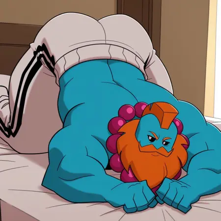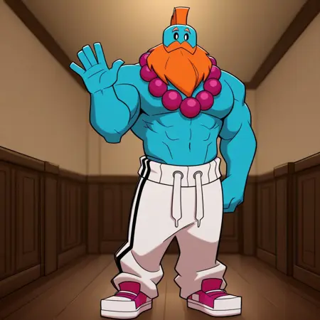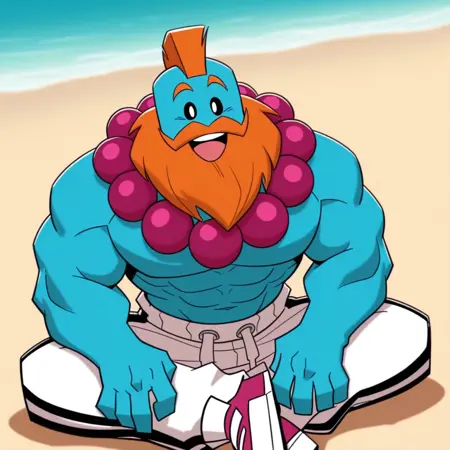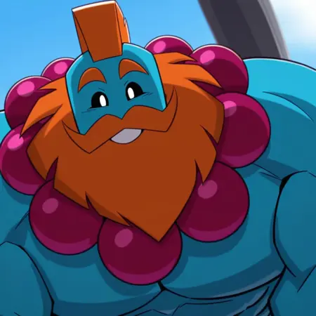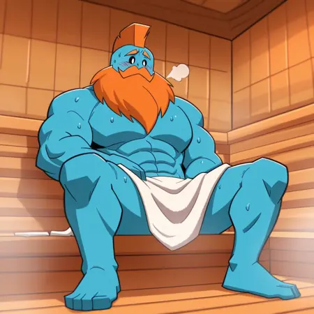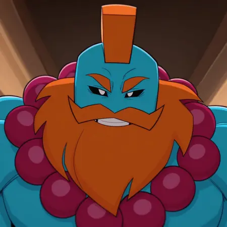 blue skin, black sclera, white pupils, orange mohawk, orange mustache, orange beard,