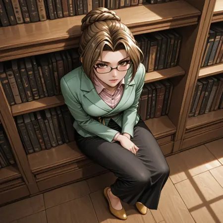 엠릴리아(Suikoden), 1소녀, 안경, 갈색 눈, 갈색 머리, 머리 땋기, 윗단 머리, 중간 길이 머리, 녹색 재킷, 긴 소매, 랩 탑, 블라우스, 칼라 셔츠, 검은 치마, 긴 치마, 슬릿 치마, 노랑 신발, 노랑 구두, 평발 신발