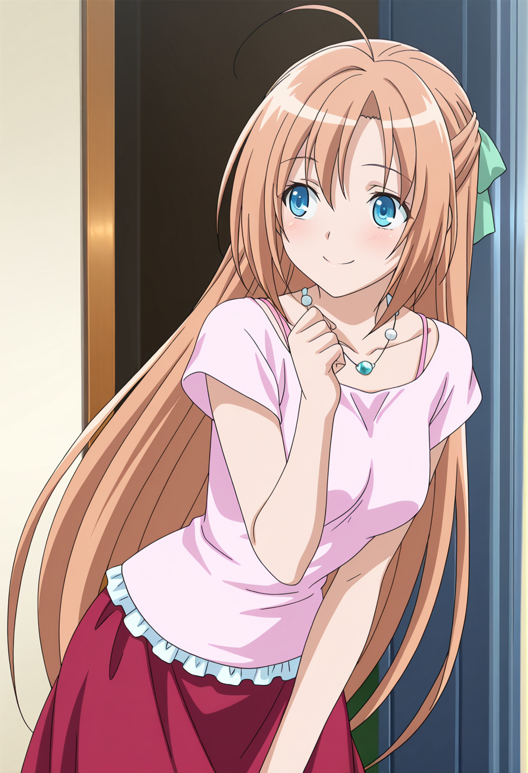 green hair ribbon, necklace, jewelry, pink shirt, short sleeves, red skirt