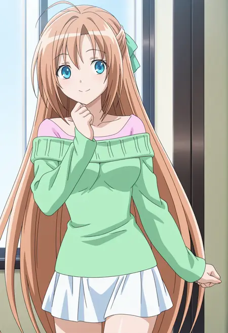 green hair ribbon, green sweater, off-shoulder sweater, strapless, long sleeves, pink shirt, off-shoulder shirt, white skirt, pleated skirt