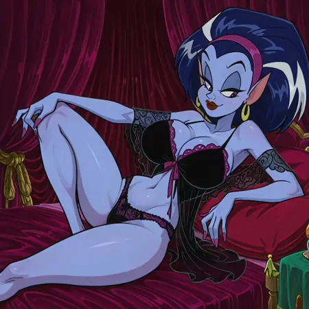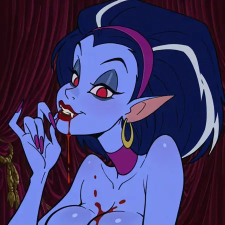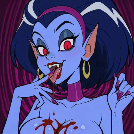 | トレーニングワード | vampire female, solo, blue skin, dark blue hair, dark blue hair with white highlights, long purple nails, long heels, black v-cut pants, black top, red lipstick, large breasts, cleavage, thin waist, thin neck, purple neckband, dark teal eyeshadow, black eyes,コピーしました! |