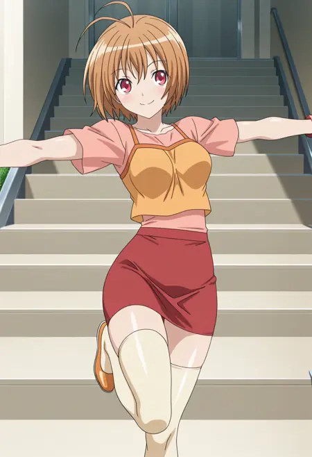핑크 티셔츠, 짧은 소매, 주황색 크롭탑, 빨간 치마, 꼭 맞는 치마, 노랑 허벅지 양말, 주황 로퍼