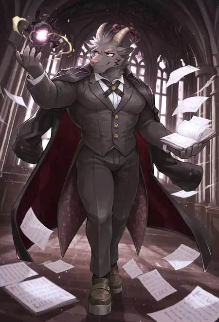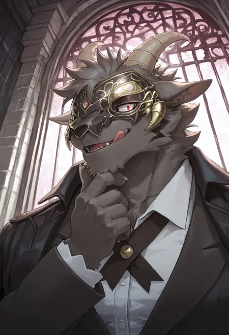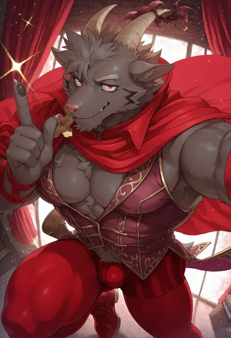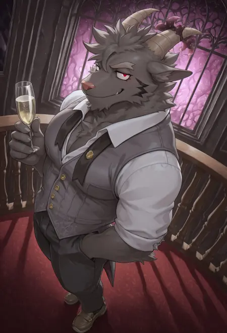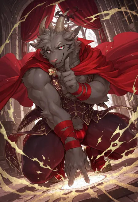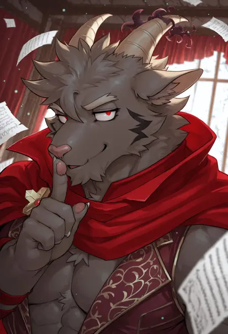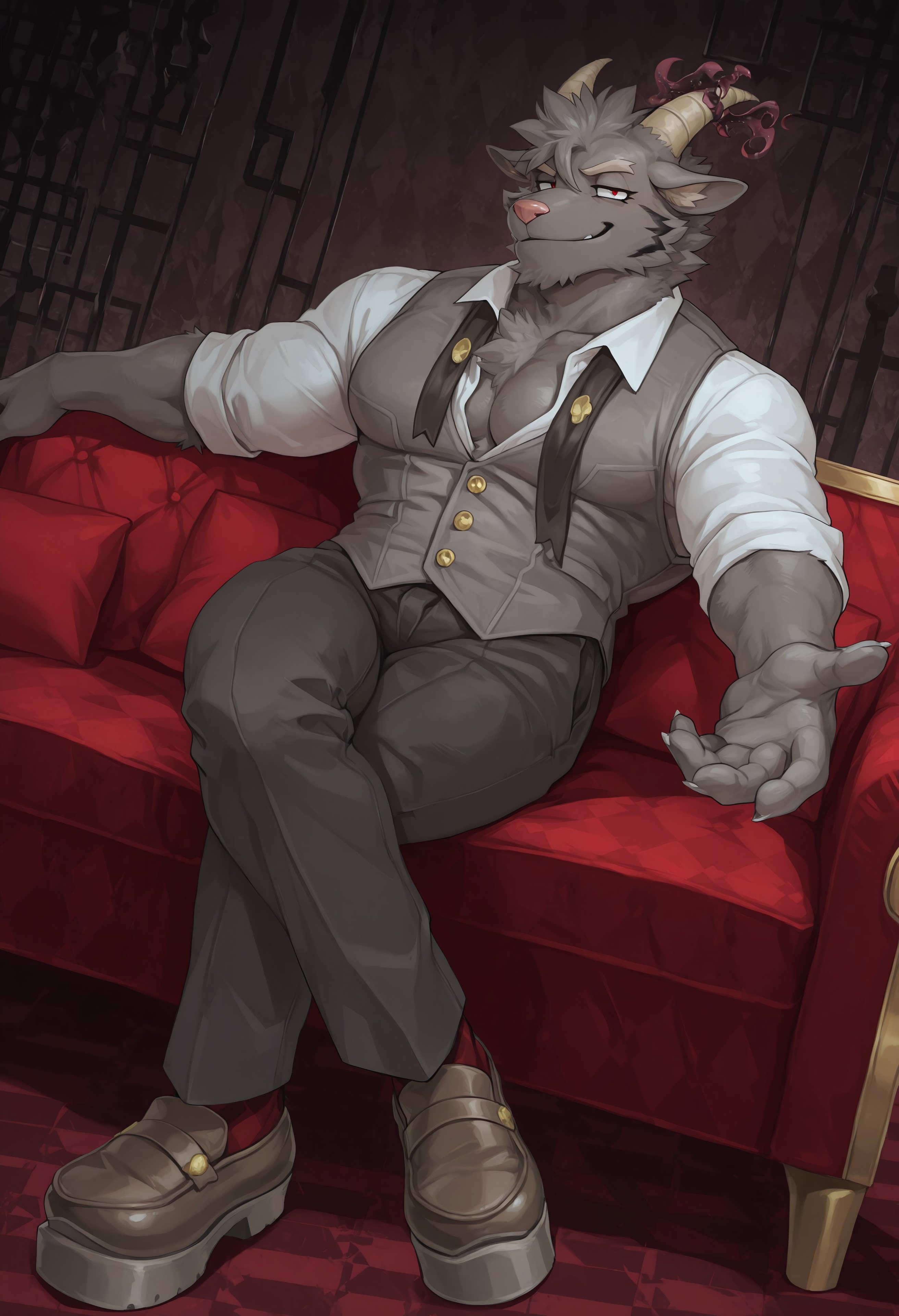 goat, goat boy, dark grey fur, goat horns, goat ears, red eyes, black eyeliner, thick eyebrows, black facial mark, male, muscular male
