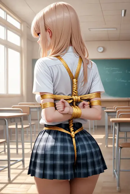 手腕交叉处极少出错的日式高手小手缚,背面视角,W型最紧的一档。适用于写实与卡通风格,兼容各类服装。可在绳子前添加颜色提示词,支持红色、棕色、白色、粉色、金色,其他颜色可自行尝试,其中金色为金属色,可呈现黄金质感。若不希望出现股绳,请将“股绳”加入负面提示词中,否则极有可能自动生成股绳。