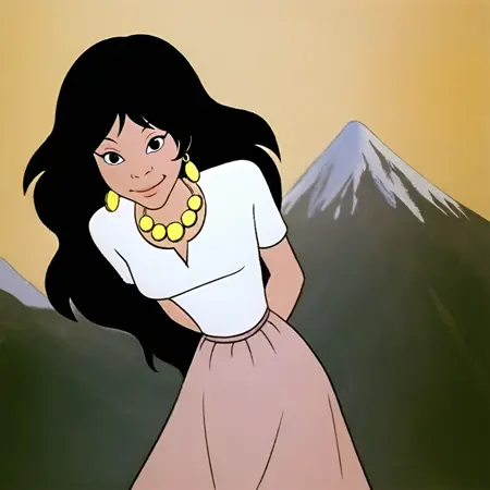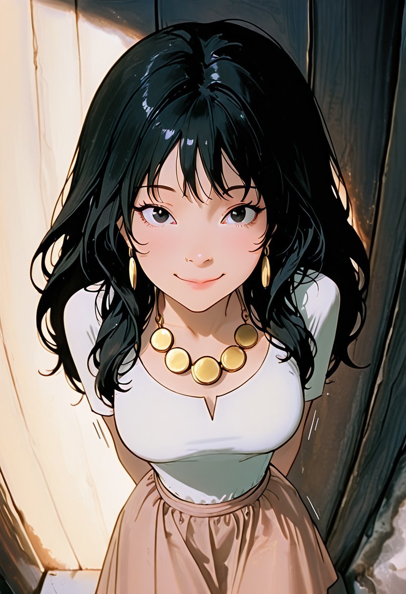 ((short-sleeves cut-out white top, gold coin earrings, gold necklace with gold coins, beige medium skirt, )) + 1-row pearl necklace,