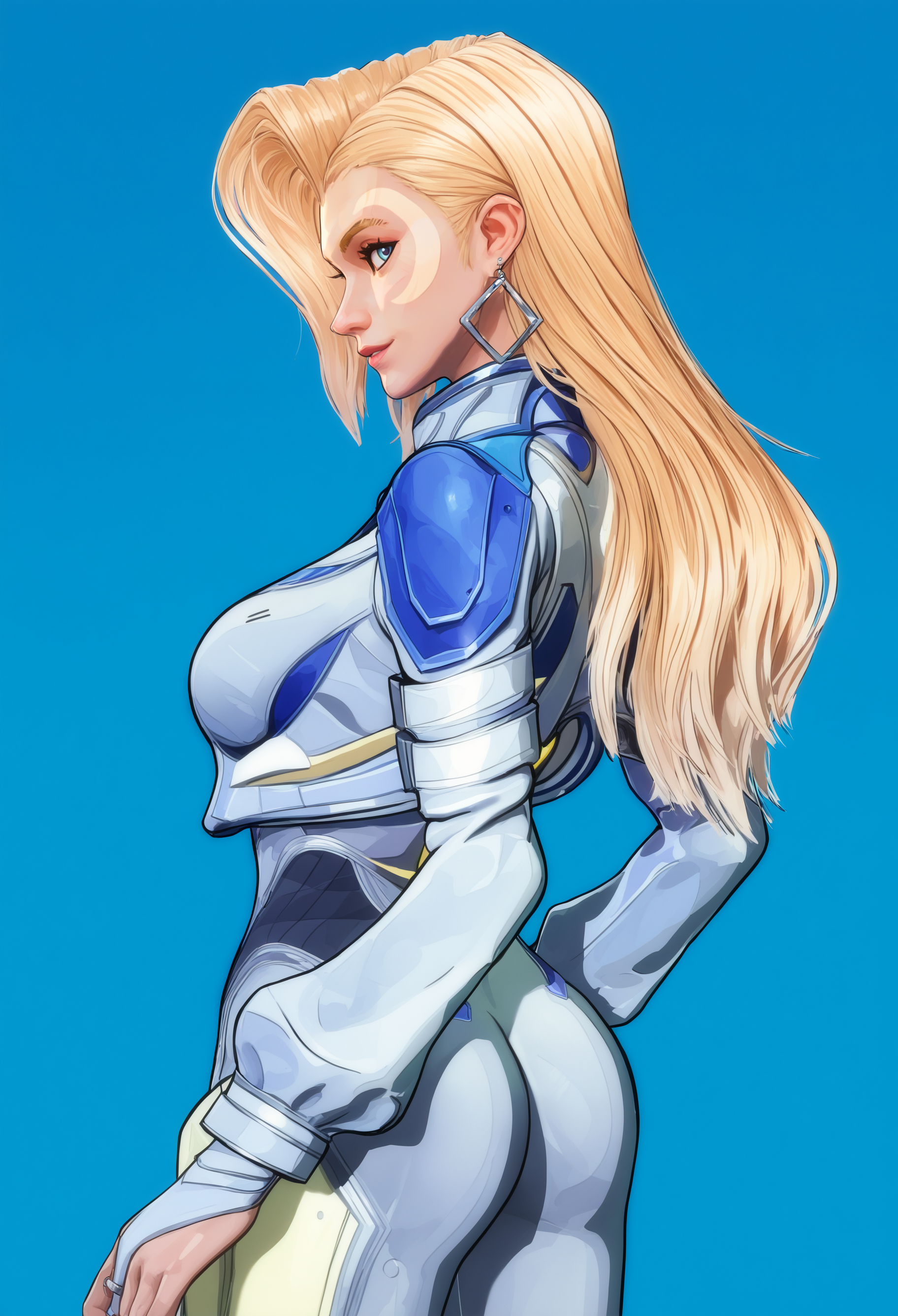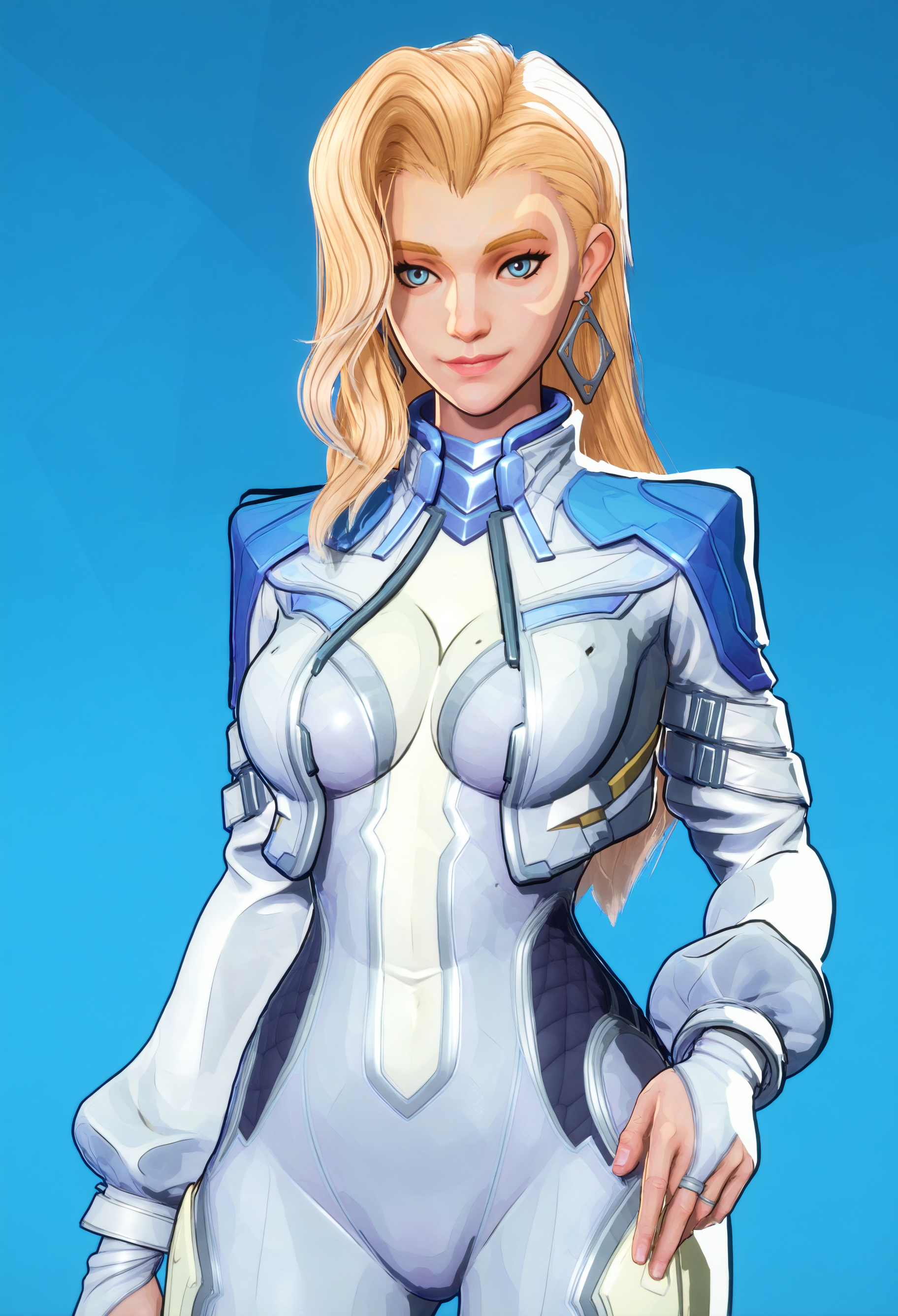 dggerrivals, 3d, blue eyes, blonde hair, long hair, hair behind ear, hoop earrings, white bodysuit, skin tight, white jacket, cropped jacket, white gloves, bridal gauntlets