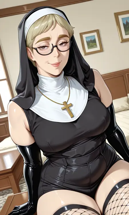 眼镜, 下框眼镜, 鱼网袜, 分离袖子, 鱼网长筒袜, 修女服, 十字架, 黑色连衣裙, 修女, 肘部手套,