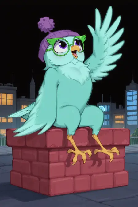 Helpful: cartoon character, anthro, avian, winged arms, feather hands, pom_hat, glasses