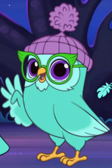 Helpful: cartoon character, anthro, avian, winged arms, feather hands, pom_hat, glasses